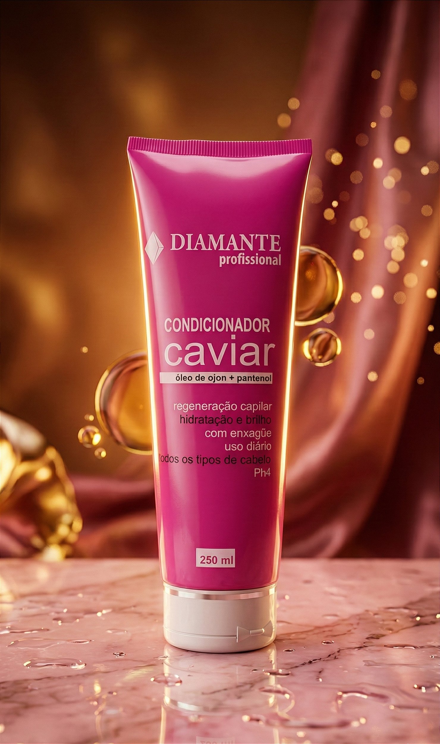 O Condicionador Caviar Diamante Profissional hidrata profundamente a fibra capilar devolvendo a umidade natural dos cabelos dando brilho e sedosidade.