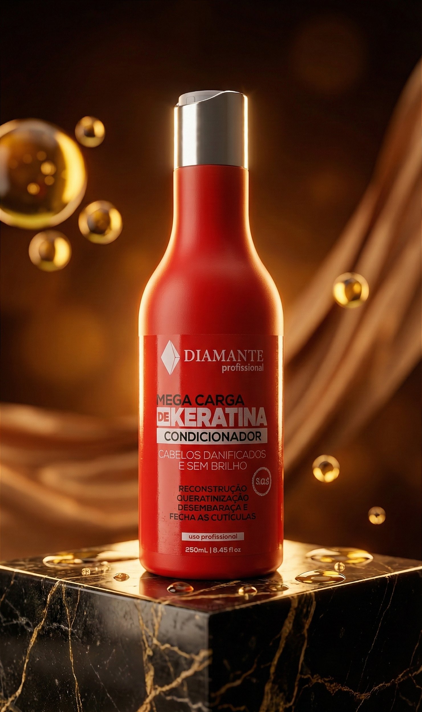 O CONDICIONADOR MEGA CARGA KERATINA para cabelos danificados, a queratina impede a quebra dos fios causados por agressões mecânicas, como pentear ou escovar o cabelo.