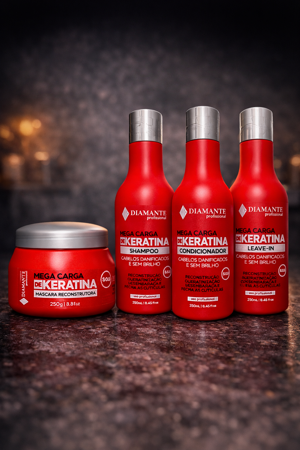 O CONDICIONADOR MEGA CARGA KERATINA para cabelos danificados, a queratina impede a quebra dos fios causados por agressões mecânicas, como pentear ou escovar o cabelo.